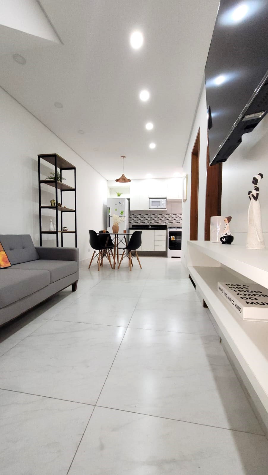 Todo em piso porcelanato, sala integrada a cozinha num conceito aberto, 2 bons dormitórios com piso laminado e móveis planejados, banheiro moderno e 1 vaga de garagem coberta.