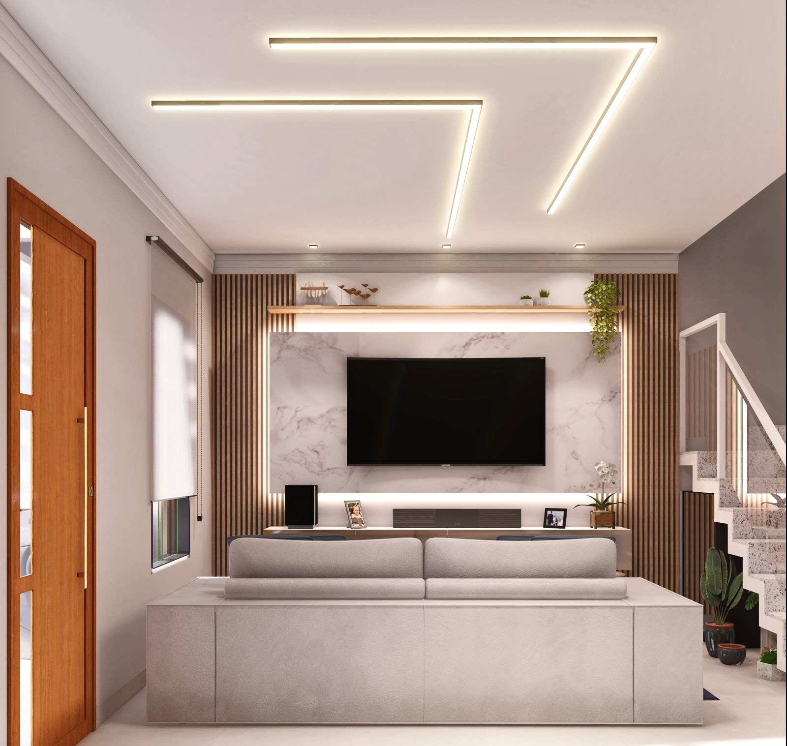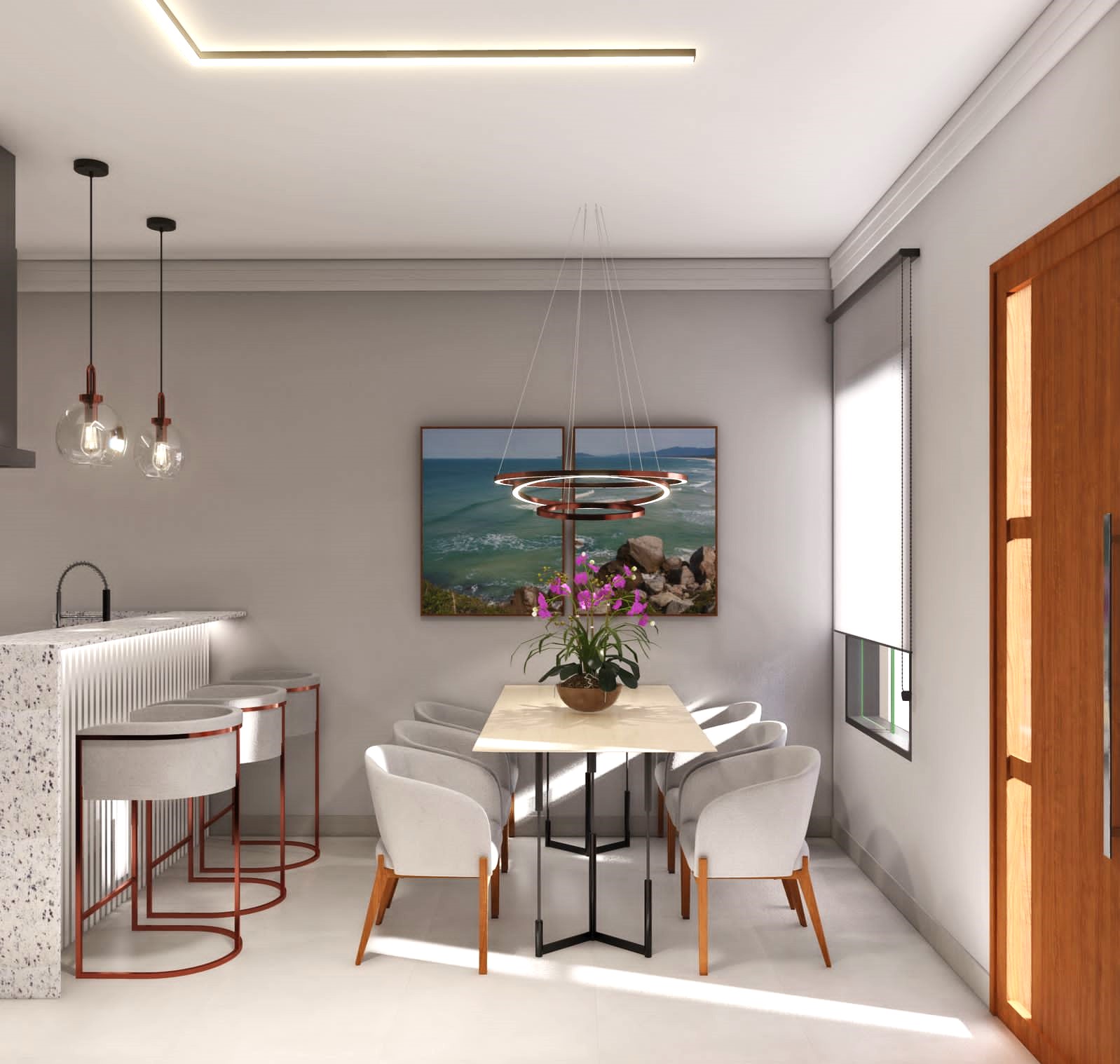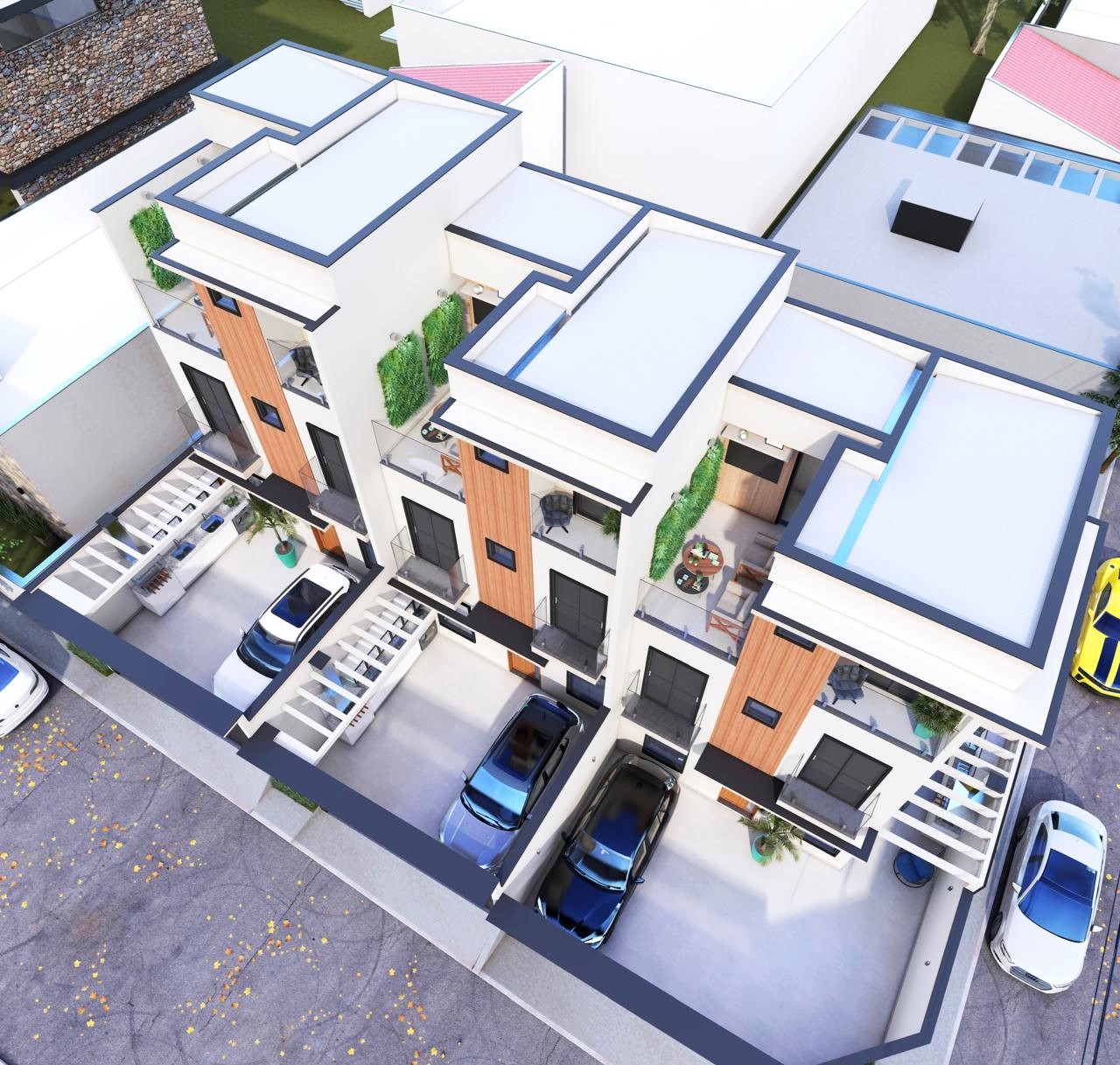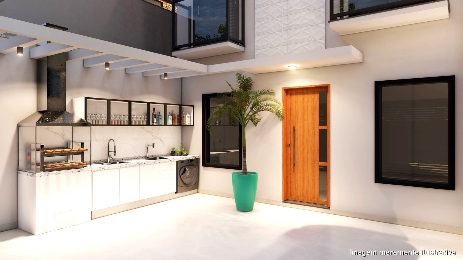 Sala ampla e integrada com a cozinha em sistema aberto com bancada, lavabo, escada em granito, 3 belas suítes com piso laminado, suíte principal com terraço e as demais com sacada, banheiros modernos, quintal com churrasqueira e 2 vagas de garagem.