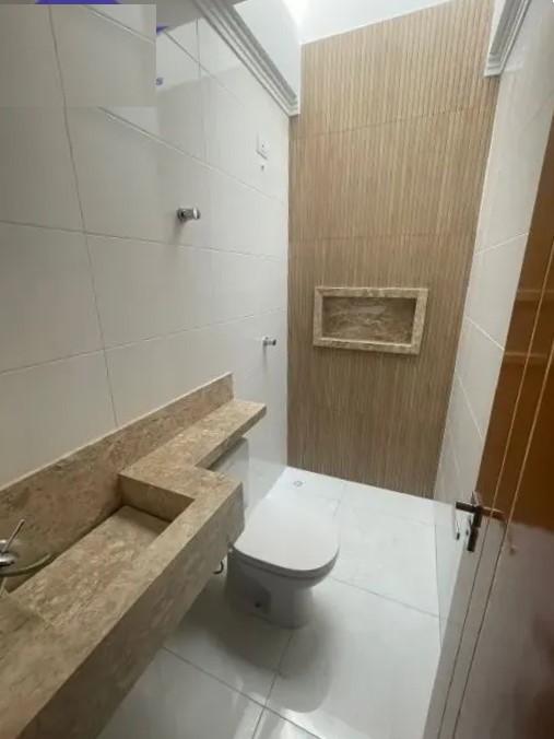 Sala ampla com piso porcelanato, cozinha com boa incidência de luz natural, lavabo, escada em granito, 3 ótimos dormitórios com piso laminado, 1 suíte com sacada, banheiros modernos, quintal com churrasqueira e 2 vagas de garagem.